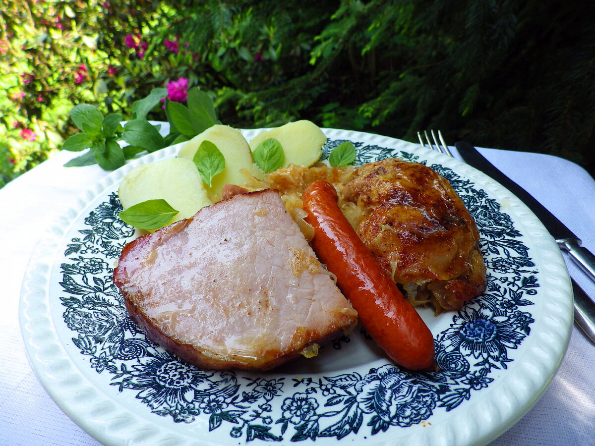 Ингредиенты Приготовление В сковороде разогреть сало, добавить нарезанный бекон, лук и слегка обжарить. Капусту промываем, даем ей стечь, кладем в форму для запекания и смешиваем с приготовленной смесью со сковороды и мелко нарезанным яблоком. Добавьте лавровый лист, ягоды можжевельника и влейте вино. Приправьте куриные ножки солью, перцем и положите поверх капусты вместе с копчеными отбивными. Выпекайте сначала при температуре 160-180 ° около 35 минут, затем раскройте и выпекайте до золотистого цвета. Мы разогреем сосиски. Выкладываем капусту, курицу, котлеты на тарелки и доливаем колбасой. Подавать с отварным картофелем или багетом и дижонской горчицей.