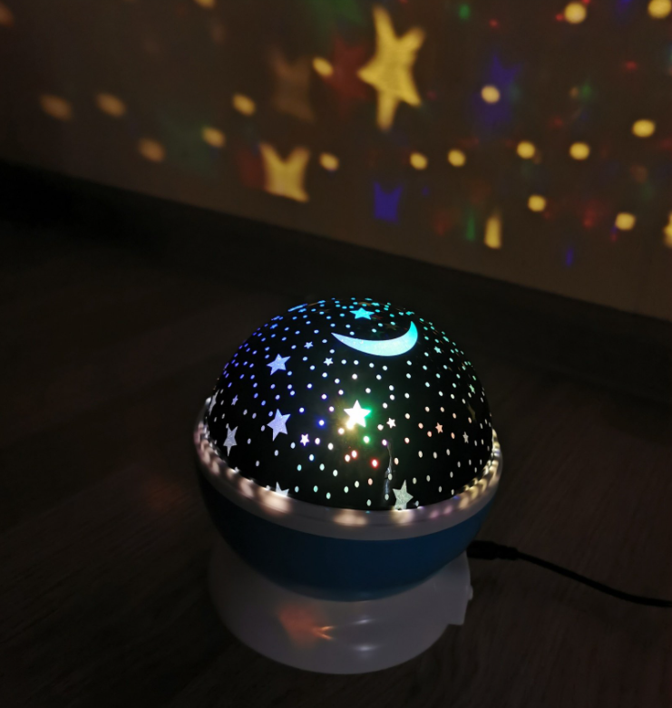 Фигуры на нем: звездочки, точки и месяц. Сам проектор под крышкой. Светится разными цветами, можно выбрать один тон или разноцветные, есть режим вращения. Переключение режимов и вход для зарядки находятся на торце в нижней части проектора. О впечатлениях Очень классная вещь, ярко светит, атмосферно и здорово, дети точно оценят))) Рекомендую! 👉 Ссылки на товар из подборки — здесь ---------------------------------