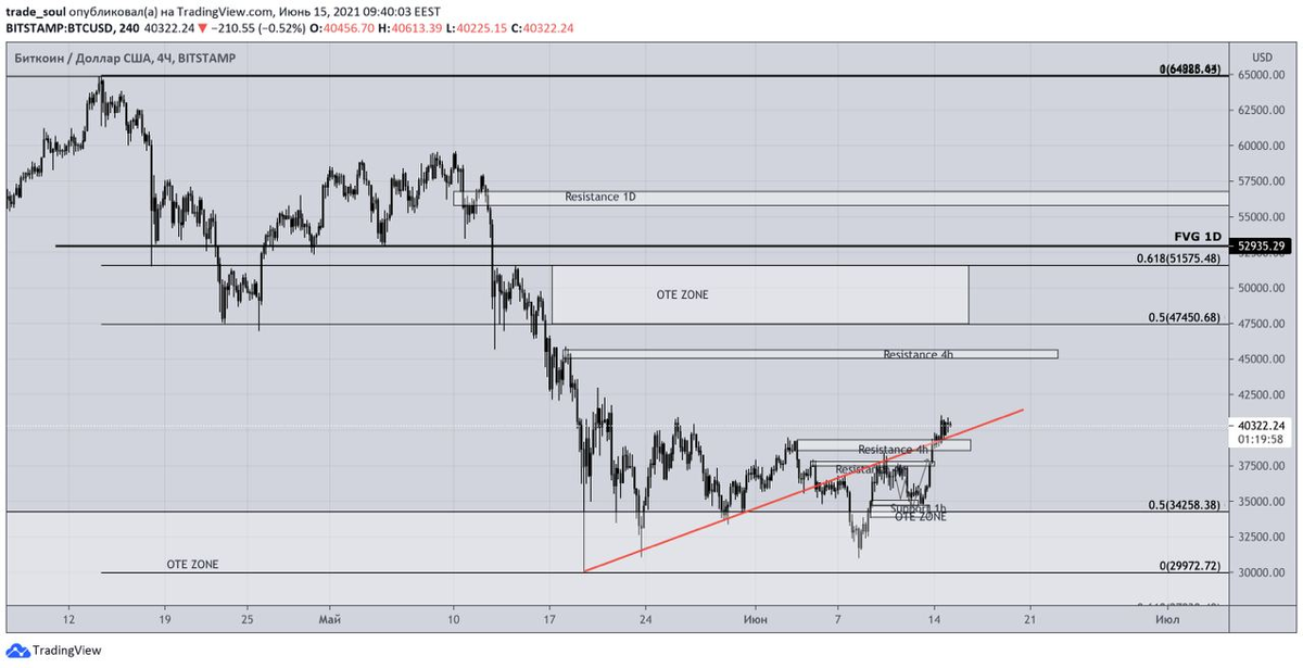 #Обзор Вчера во второй половине дня покупателям удалось закрепиться выше 39400, цена достигала дневного максимума на отметках 41064 (Binance), после чего последовал откат. Капитализация рынка 1750 млрд., индекс доминирования 43.38% Альткоины следуют за главной криптовалютой. Пробили сопротивление, закрепились выше него, так же произошел закреп выше трендовой. Пока мы находимся выше этих значений, ожидаю дальнейший рост к следующей полке сопротивления 4ч ТФ ~45000. Хочу напомнить про зону коррекциии падения, а это отметки 47450 - 51575. Там я и буду искать хороший шорт. Фондовый рынок завершил торги понедельника разнонаправленно. Dow Jones упал на 0.25%, индекс S&P 500 вырос на 0.18%, индекс NASDAQ подорожал на 0.74%. Индекс доллара опустился на 0.06% до 90.477. Нефть продолжает рост. Всем хорошего дня и профитов!