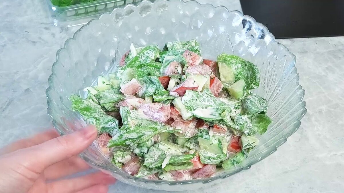 Салат из БОТВЫ редиса. Вершки или Корешки 🥗 Редис принадлежит к овощам, у которых надземная и подземная части практически равноценны с точки зрения их применения в пищу. Ботва редиса, которую хозяйки обычно выбрасывают, обладает легким пряным вкусом — тонким, приятным, своеобразным, в котором чувствуется легкая горчинка. В ней содержатся все витамины и микроэлементы, которые есть в корнеплоде, но только в более концентрированной форме. Редисочная ботва благодаря присутствию горчичного и эфирного масел, обладает приятным вкусом, а так же ярко выраженными лечебными и косметическими свойствами. По набору полезных веществ и их концентрации редисочная зелень превосходит более популярную подземную часть растения. Ботва редиса прекрасно дополнит любой овощной салат, один из таких салатов мы с вами сегодня приготовим. Для салата: Ботву хорошо промываем и рвем ее или нарезаем небольшими кусочками. Помидоры нарезаем так же не большими дольками или кубиком Огурец очистить и нарезать четве