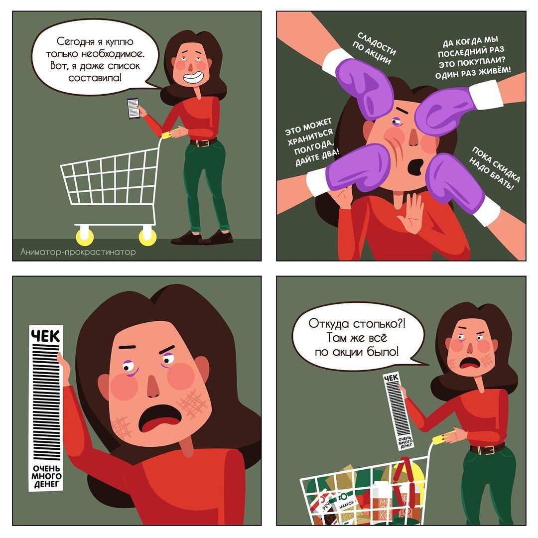 Все сетевые авторы, которые занимаются созданием веб-комиксов, совершенно по разному ведут свои творческие странички: кто-то предпочитает оставаться анонимным и кроме своих работ с подписчиками больше ничем не делится, ну а кто-то напротив - превращает свои соцсети во что-то вроде личного блога и вместе с новыми комиксами не забывает делиться с подписчиками разными мыслями и время от времени рассказывать о событиях собственной жизни. Отличный пример второго стиля ведения соцсетей мы рассмотрим в сегодняшней статье - художница, о которой пойдет речь, ведет интересный блог о своей жизни, используя комиксы как отличный способ визуализации различных забавных жизненных ситуаций. Аниматор-прокрастинатор - это творческий псевдоним российской художницы Алёны Халимончук. Алёна живет в городе Тольятти и работает моушен-дизайнером, а в свободное время рисует небольшие комиксы и создает забавную анимацию для своего творческого блога в Инстаграме (на момент написания статьи - более 6 тысяч подписчи