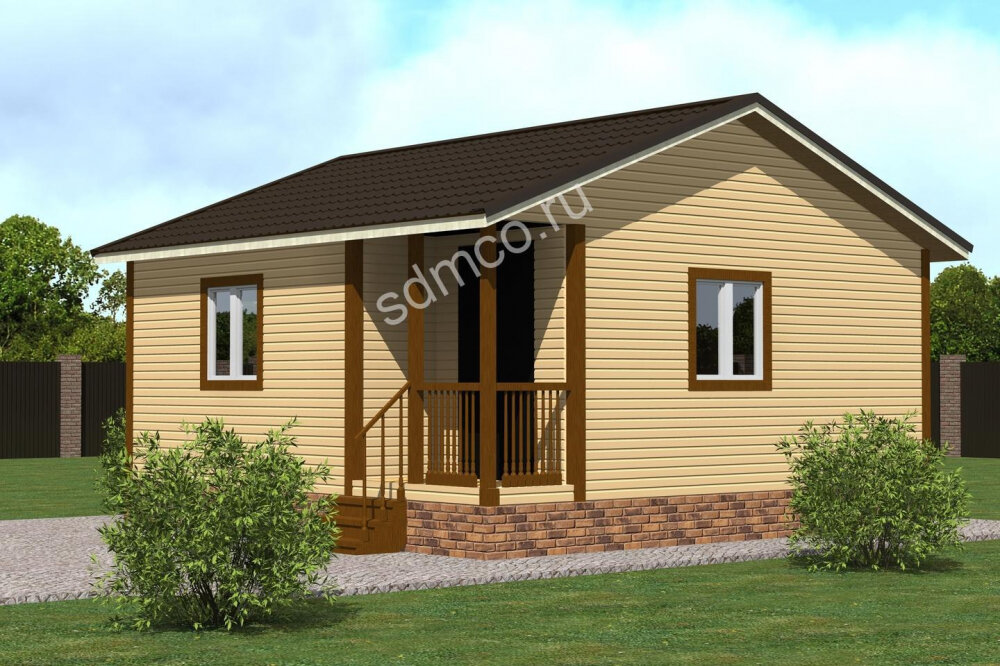 Каркасно-щитовой дом "Иволга" от строительной компании "СДМ Групп". Площадь застройки: 6 x 6 м Общая площадь: 36 м2 Стоимость: от 205 000 руб. Недорогой щитовой дом 6 на 6, построенный на опорно-столбчатом фундаменте, отлично подходит для проживания на даче. В доме есть деревянные окна, межкомнатные двери, крыльцо и входная дверь из металла. Крыша строения покрыта оцинкованным гофром. Такой дом также подходит для проживания в зимнее время. Стены строения отделаны вагонкой изнутри и снаружи. Дом имеет небольшое крыльцо.