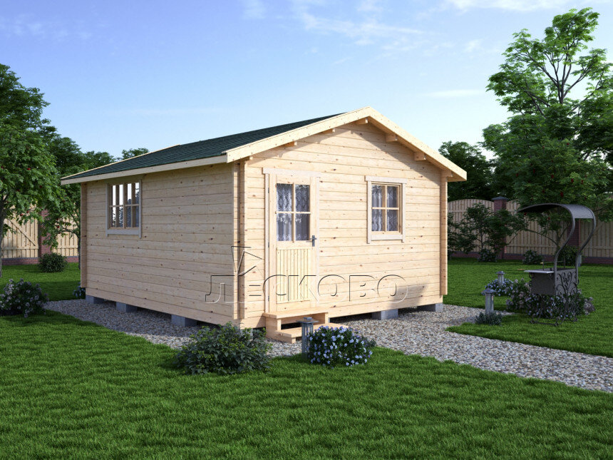 Дачный дом из минибруса серия "ДС" от строительной компании "Лесково". Площадь застройки: 4.5 x 5 м Общая площадь: 22.5 м2 Стоимость: от 207 173 руб. Стеновой комплект: мини-брус камерной сушки 44×145мм с чашами под проект. Материал дерева — ель, сосна (ГОСТ 8486). Влажность 12-14%. Высота стен 2,16 м.; Лаги, нижняя обвязка: доска 45×145 мм. камерной сушки 10-12%; Полы: половая доска 35 мм., камерной сушки; Потолок: имитация бруса 20×135 мм., камерной сушки; Деревянные окна, стекло 4 мм., одинарные. Обработка бесцветным антисептиком. Фурнитура; Деревянные двери; Наличники: сухая строганная доска 20×100 мм.; Кровля: битумная черепица «Шинглас»; Плинтус 35 мм