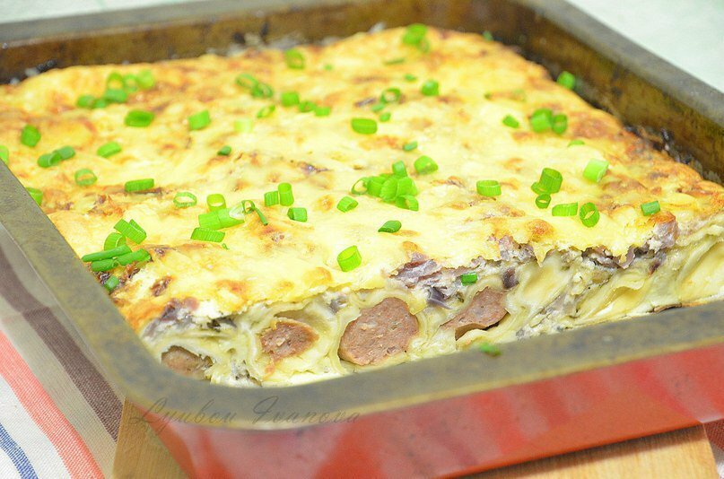 1️⃣ Смажь форму растительным маслом, закинь плотным слоем пельмени, сверху выкладывай обжаренные грибы, посыпай паприкой и перцем.