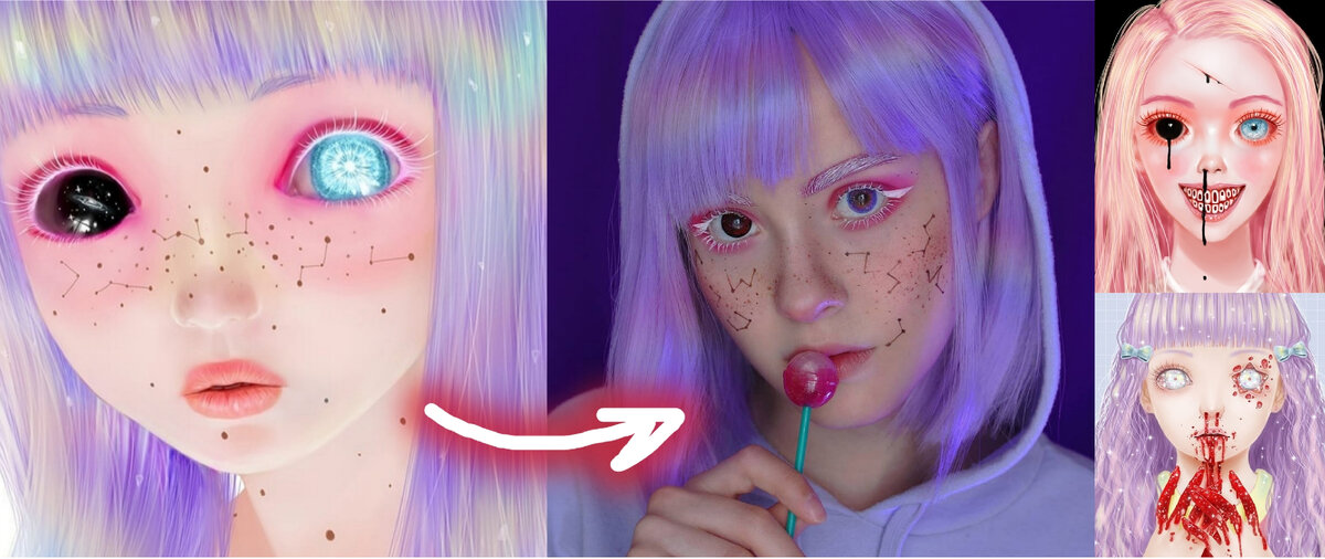 Привет, в последнее время меня всё чаще расспрашивают о источниках, вдохновляющих меня на создание снимков в инстаграм. На самом деле, ответить на этот вопрос достаточно сложно и легко одновременно. Вдохновиться можно чем угодно: новые впечатления, окружающие, искусство, природа и многое другое. Главное - уловить суть, интерпретировать и зафиксировать те самые эмоции и чувства, пораждающие картинки в голове. Сегодня я покажу довольно пугающие картины художника Sacc.stry которые настолько запали в душу, что появилось непреодолимое желание их "оживить". Думаю, многие из вас сталкивались с работами художника в интернете. Особую популярность они обрели в 2018 году. Уникальный стиль, совмещающий детскую невинность и нечто жуткое, притягивал взгляды. На просторах инстаграма и тамблера всё чаще всплывали картинки девочек-инопланетянок с цветными волосами, сверкающими глазами, усыпанные кристаллами, а иногда ссадинами и царапинами. Все оригиналы артов можно найти в инстаграм профиле автора: @