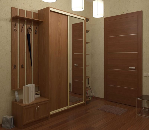 Корпусные шкафы-купе не менее удобны, чем встроенные. Правильно подобранный дизайн и оттенок великолепно вписывается в антураж прихожей, становится стильным украшением. Так, изделия под темное дерево придают помещению респектабельный вид, создают атмосферу достатка и уюта.