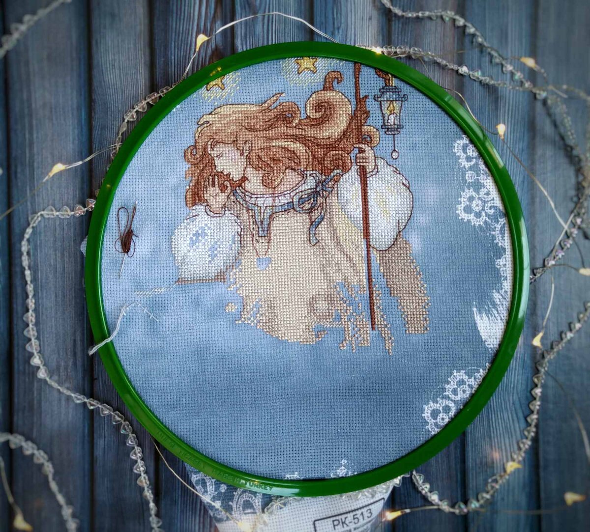Мои подписчики уже заметили, что я люблю ажуры, сложный бек, персонажей, кудряшки, кружева. Поэтому за этот сюжет взгляд у меня сразу зацепился. Была распродажа на WB и я купила этот набор рублей за 200. Он прождал в очереди на отшив около года. Единственное, что меня изначально не устраивало в сюжете - пропорции хранителя. Вроде как это ангел - у него такие рукава как крылья. Поэтому я часто его называла ангелом. Но этот ангел маленечко хобби. Какое-то у него тело странное. Слишком уж коренастое. Это мне не понравилось и я удлиннила ему район талии рядов на 8. Сделала перенабор, перерисовала схему, заодно изменила еще цвет банта на детской люлечки, ведь у меня 3 сына, розовый бант маленечко не в тему) во всяком случае до внуков еще далеко)))) Удлиннение ангела сыграло плохую шутку. Мне не хатило примерно 3 ниточки основного цвета, как раз много его ушло в "талию". Но я подобрала замену из своей палитры СХС, замененный цвет идет по нижней части левого рукава, но он по большей части в