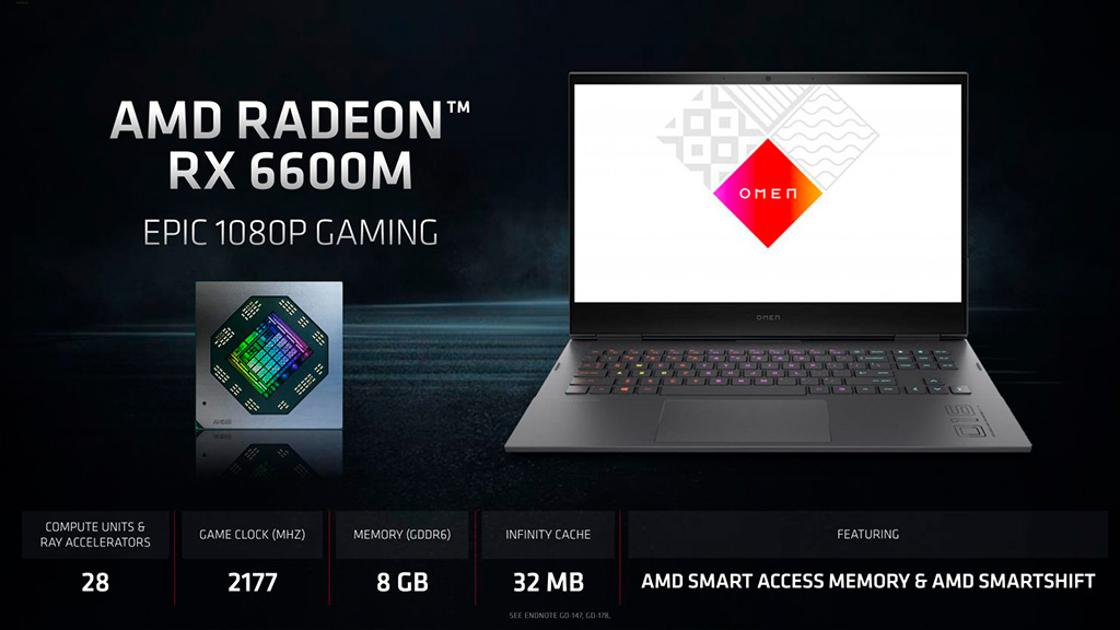 2 недели назад AMD представила серию мобильных видеокарт Radeon RX 6000M, в которую вошли три модели: Radeon RX 6600M, RX 6700M и RX 6800M. На данный момент в продаже только-только начали появляться оснащённые старшей моделью лэптопы, да и то только в США. Тем временем в Сети появились результаты тестов самой младшей версии – RX 6600M. Предположительно, адаптер был протестирован в составе ноутбука HP Omen 16, но в действительности весомого значения это не имеет, поскольку все включенные в сравнение мобильные видеокарты были протестированы в тандеме с процессором Ryzen 7 5800H. Напомню, Radeon RX 6600M – первая видеокарта на базе графического процессора Navi 23. В полноценном виде он насчитывает 2048 потоковых процессоров, но в составе RX 6600M усечён до 1792. Также данный GPU получил 32 МБ кэш-памяти Infinity Cache, 128-битную шину данных, сопрягаемую с 8 ГБ видеопамяти GDDR6. Графический процессор работает при частоте до 2177 МГц (Game Clock), а уровень TDP производители ноутбуков мог