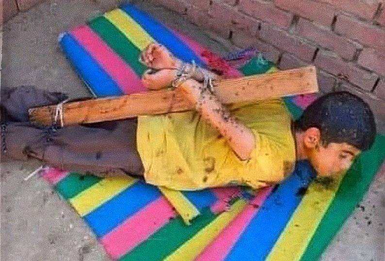 В Египте отец в качестве наказания привязал своего сына к столбику и покрыл его мёдом, чтобы привлечь к нему пчёл.