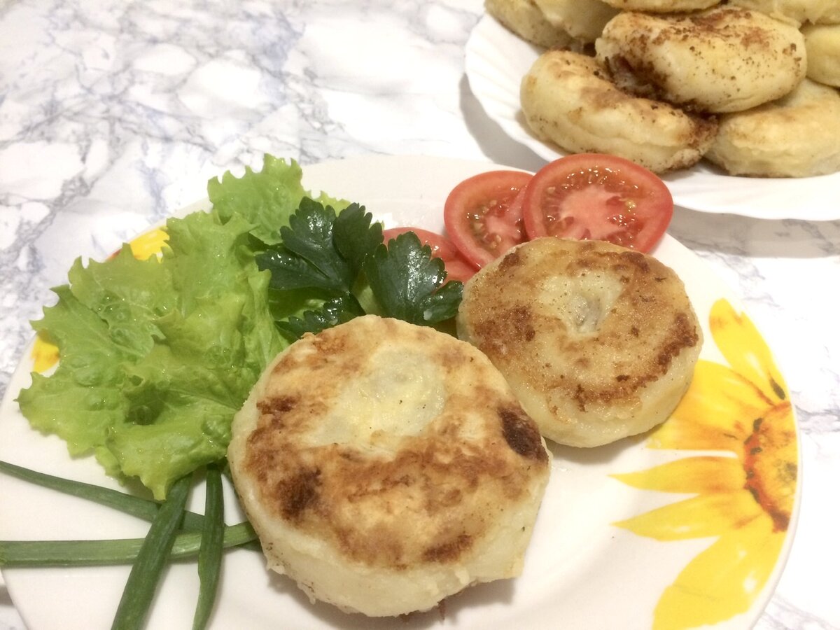 Картофельные котлеты ( биточки ) с начинкой из сыра и копчёной колбасы.