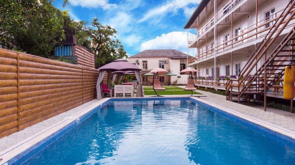 Мини-гостиничка очень понравилась. В номере уютно, просторно для двоих. Есть кондиционер, телевизор. Территория ухоженная, есть беседки для отдыха и бассейн. Вода в нем подогревается круглосуточно, особенно это приятно в холодное время года, когда море еще холодное. Есть столовая, где у хозяйки можно заказать завтрак и ужин. Цены приемлемы, доступны, порции на убой. Можно готовить и самим. Для готовки все предоставляется: плита, кухонная утварь, посуда. Имеется стиральная машинка, несколько сушилок для стиранного белья на каждом этаже и утюг один на три этажа. Интернет бесплатно. Есть парковка для машин