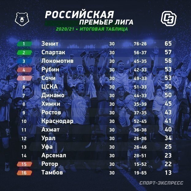 Итак, завершилась Российская премьер лига и победителем в третий раз подряд стал Зенит, но стоит разобраться в какие еврокубки попали другие команды. И хочу напомнить, что по таблице коэффицентов УЕФА Россия занимает 8 место и путёвок в лигу чемпионов у нас две, вместо трёх. Сочи - клуб занял 5 место и отправится во второй отборочный раунд Лиги Конференций. Рубин - клуб занял 4 место и отправится в третий отборочный раунд Лиги Конференций. (Про неё у меня уже была статья) Локомотив - клуб завоевал бронзовые медали чемпионата и попробует свои силы в групповом этапе Лиге Европы. Спартак - клуб завоевал серебряные медали чемпионата и отправится в третий отборочный раунд Лиги Чемпионов. Зенит - клуб выиграл премьер лигу и выступит в групповом этапе лиги чемпионов. Спасибо за внимание!