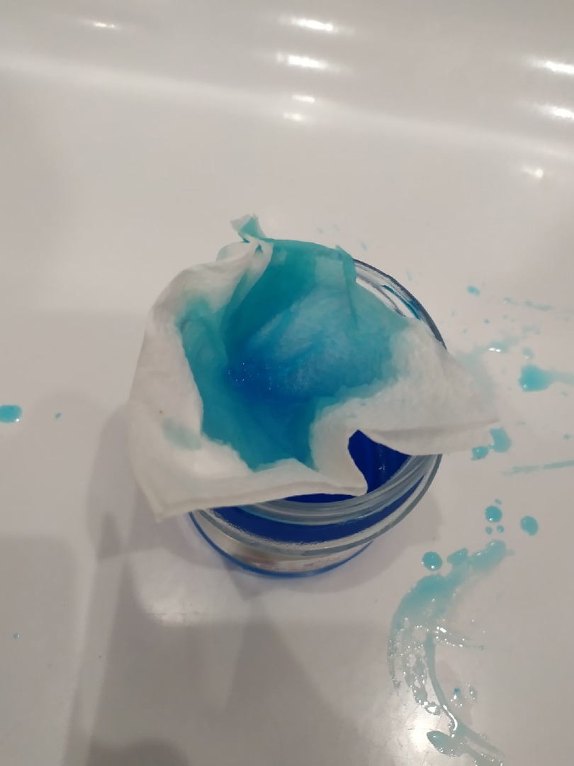 Нам требуется подготовить емкость. Далее надо налить в емкость примерно 200 миллилитров кипятка и постепенно добавить 100 грамм медного купороса и все это профильтровать через фильтр (можно использовать плотную салфетку). Далее надо подвесить нитку с узелком на маркер и положить на емкость с раствором. Также на нитку можно подвесить и другие предметы, например, камень. Трудности, которые могли возникнуть По плану надо сделать перенасыщенный раствор, из которого при остывание выпадет осадок из кристаллов. К сожалению этого может не произойти, если у вас получится просто насыщенный раствор. В таком случае, не расстраивайтесь, ведь можно подвесить на нитку не кристаллики, а просто сделать на ней узелок(центр кристаллизации)