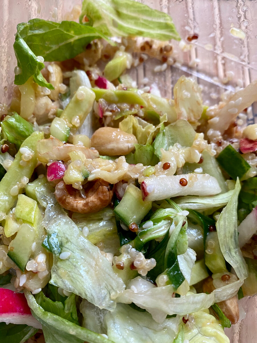Ингредиенты: Киноа отварное - 1 ст л Редис - 2-3 шт Свежий огурец - 1 шт Айсберг/радичио/романо - 90 г Сыр тофу Нут отварной - 1 ст л Кешью - 1 ст л Заправка: Оливковое масло, соевый соус, сахар, соль и Корень имбиря (все смешать по вкусу) Салат промыть, откинуть на дуршлаг, чтобы стекла вся лишняя жидкость. Выложить в миску листья салата, добавить нарезанные соломкой огурцы и редис, тофу, порезанный кубиком, киноа, нут, кешью, приправить салат соусом и тщательно перемешать. По желанию украсить белым кунжутом. Получается очень легкий, полезный и насыщенный салат. Спасибо, что читаете мой канал. Подписывайтесь, ставьте лайки. Ваша тетя Соня