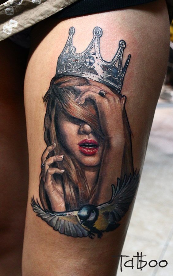 Татуировка королева обозначает власть, престиж, уверенность, спокойствие, статность, могущество, грацию, красота, лидерство, сила, долголетие, победу. Королева всегда ассоциируется у общества с величием, престижем, однако, татуировку с рисунком королевы набивают нечасто. Но те, кто решился на такой поступок, стремятся показать свою власть, свое могущество, высокий статус в обществе. Такую татуировку могут набивать как мужчины, которые показывают свою уверенность и высокий социальный статус, так и девушки, которые хотят показать превосходство над другими девушками. Очень часто королеву изображают с крестом. Такой вариант изображения пошел еще со времен Средневековья. Часто на средневековых фресках и картинах личности королевской семьи держали крест в руках, что символизировало собой Божье благословение.