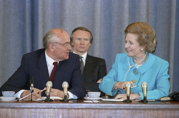 Совместная пресс-конференция Маргарет Тэтчер и Михаила Горбачева в Москве, 1990.