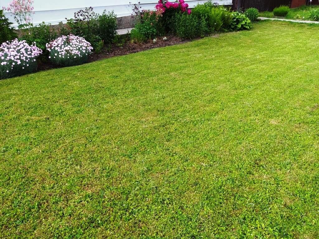 Газон перед домом за забором (придомовая территория) — тоже условно делится на «нашу» и «соседскую». И тут не у всех разбит газон и посажены цветы. Но иногда человек работает не только за себя, но и «за того парня». И хорошо, если отношения с соседями мирные и соседские. И силы хватает на то, чтобы ухаживать не только за своей землей. У нас в городе (Тверская область) после войны строили много домов сразу на несколько семей. На 2-4 семьи и отдельными входами. Делалось так исключительно ради экономии. Ведь часть внутренних стен была общая. Иногда была общей и система отопления, водоснабжения. Но время показало, что люди не хотят зависеть ни в чем от посторонних чужих людей (соседей). Посмотрите, на двух верхних фото — как раз дом на две семьи. Это заметно по разнице в отделке фундамента. И совсем не заметно по внешнему виду придомовой территории. Потому что ухаживает за территорией только аккуратная и трудолюбивая хозяйка одной из половинок дома. И тут даже хорошо, что соседи не спорят.