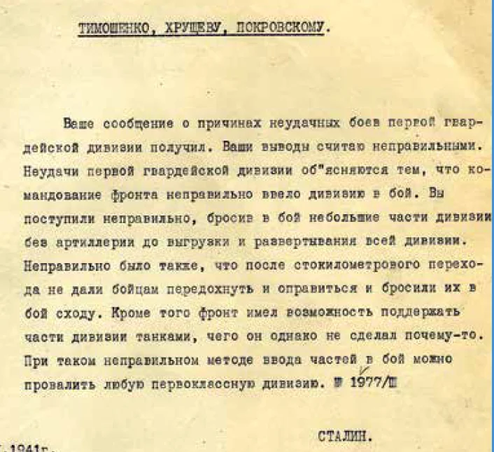 Война в редких фотографиях и рассекреченных документах 1-16 октября 1941 года Мы продолжаем публиковать фрагменты из выпущенного «Комсомольской правдой» альбома «Главные документы Великой Отечественной войны». Только документы и факты, без комментариев. Показываем самые интересные Продолжение. Начало здесь 05.10.1941 Телеграмма И. Сталина командующему Юго-Западным фронтом С. Тимошенко, члену Военного Совета фронта Н. Хрущеву и начальнику штаба А. Покровскому. Рукопись и заверенная машинописная копия Тимошенко, направляя Сталину соответствующие материалы, в качестве главной причины неудачных действий гвардейцев в сентябре 1941 года назвал «недостаточную боевую сколоченность гвардейской дивизии». В ответ - в телеграмме, не разнос, не угрозы, а именно терпеливый урок военного дела. Выражаясь современным языком, И. Сталин дал маршалу С. Тимошенко «мастер-класс» на тему «Ввод стрелковой дивизии в бой». *** Последний рубеж. 08.10.1941 Постановление ГКО № 740сс, подготовленное наркомом внутре