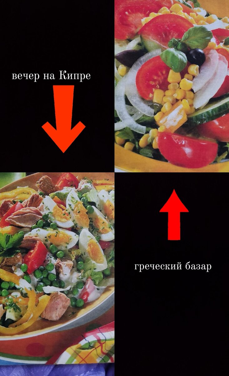 Продолжение темы- прави льное питание. С приходом жарких дней хочется поменять все меню- вместо сытного и жирного есть что-то легкое. Эти салатики - то,что надо! 1 ВЕЧЕР НА КИПРЕ На 4 порции 1/6 кочана молодой капусты или салатных листьев, 2 сладких перца, 3 помидора,3 яйца, горошек свежий или консервированный, 5-6 веточек петрушки, 1 банка консервированного тунца в собственном соку. Для соуса: 1/4 лимона, растительное масло, черный молотый перец, соевый соус или соль Готовим: 1. Капусту или салатные листья тонко нашинкуйте. Яйца отварите,очистите и нарежьте дольками.Помидоры тоже нарежьте дольками, перец-колечками, петрушку покрошите. Все перемешайте, добавьте горошек и рыбу (предварительно слейте маринад) 2 Для соуса в масло выжмите сок лимона, добавьте соевый соус, немного перца и перемешайте. Заправьте салат. Время приготовления: 30 мин. В одной порции около 200 ккал 2 ГРЕЧЕСКИЙ БАЗАР На 4 порции 3-4 помидора, 2 огурца,1/2 банки консервированной, разные салатные листья, в