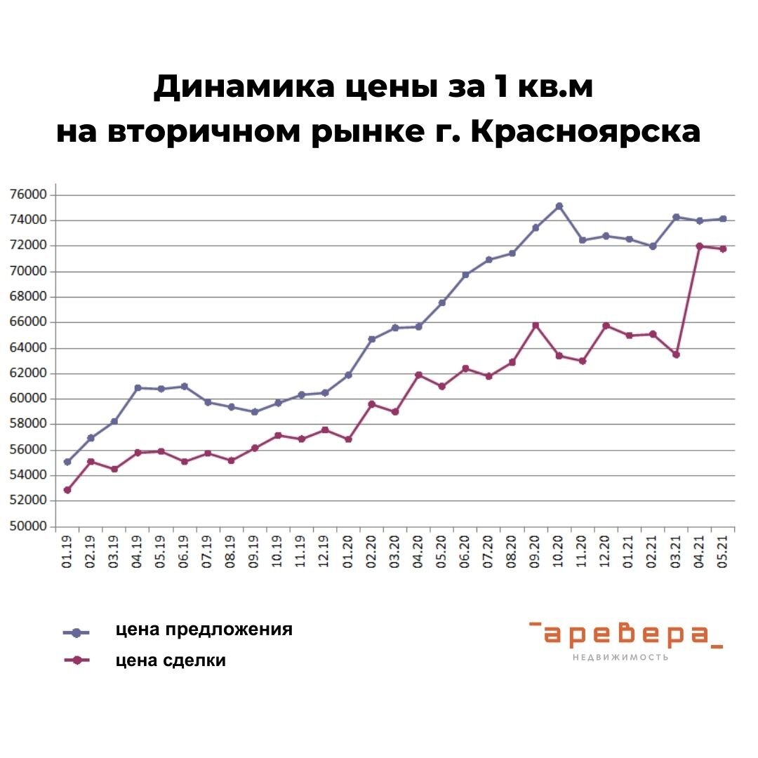 Уже в апреле мы начали отмечать признаки равновесия – рост цен замедлился, разрыв между средними ценами предложения и сделки сократился, существенных изменений в цене нет. Средняя цена за 1 м2 на вторичном рынке 74150 рублей (цена сделки на 5% ниже).