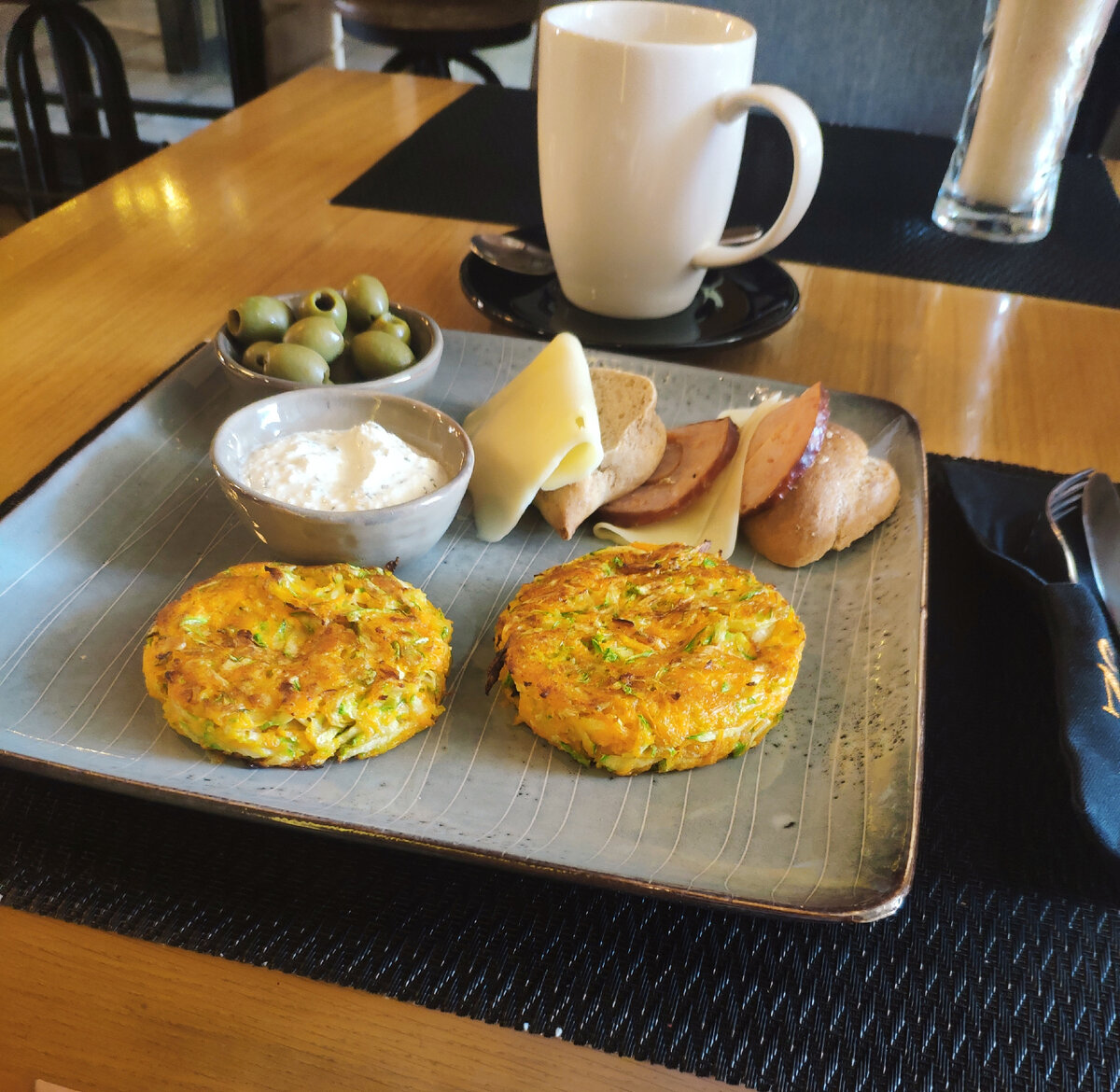 КофеНова - кафе в Нур-султане известное, даже есть в каких-то путеводителях. Забегая вперёд - удивительно, что там кому-то понравилось! Официанты встретили не слишком приветливо, будто я отвлекла их от важных дел. Спасибо, что подали меню. Я знала, что в кафе есть завтраки до 12 часов. Один из них и выбрала. К завтраку идёт кофе, включенный в стоимость 2.200 тенге (около 370 рублей). Такое предложение - редкость для Казахстана. Культуры комбо-предложений в виде завтраков или ланчей здесь почти нет! Итак, мой завтрак: кабачковые оладьи, оливки, греческий йогурт как заправка, тосты, сыр и ветчина из индейки. Это то, что было заявлено. А на деле-то что? Заказ готовили минут 30. Благо принесли американо сразу (сносно). Кабачковые оладьи - прекрасны! 5 из 5. Внутри много главного овоща, также морковь 🥕 и совсем немного теста, которое это все склеивает. Однако вес блюда официант мне назвать не смог. Карманные весы показали 220 грамм на 2 оладушка. Но на этом приятные впечатления и закончи
