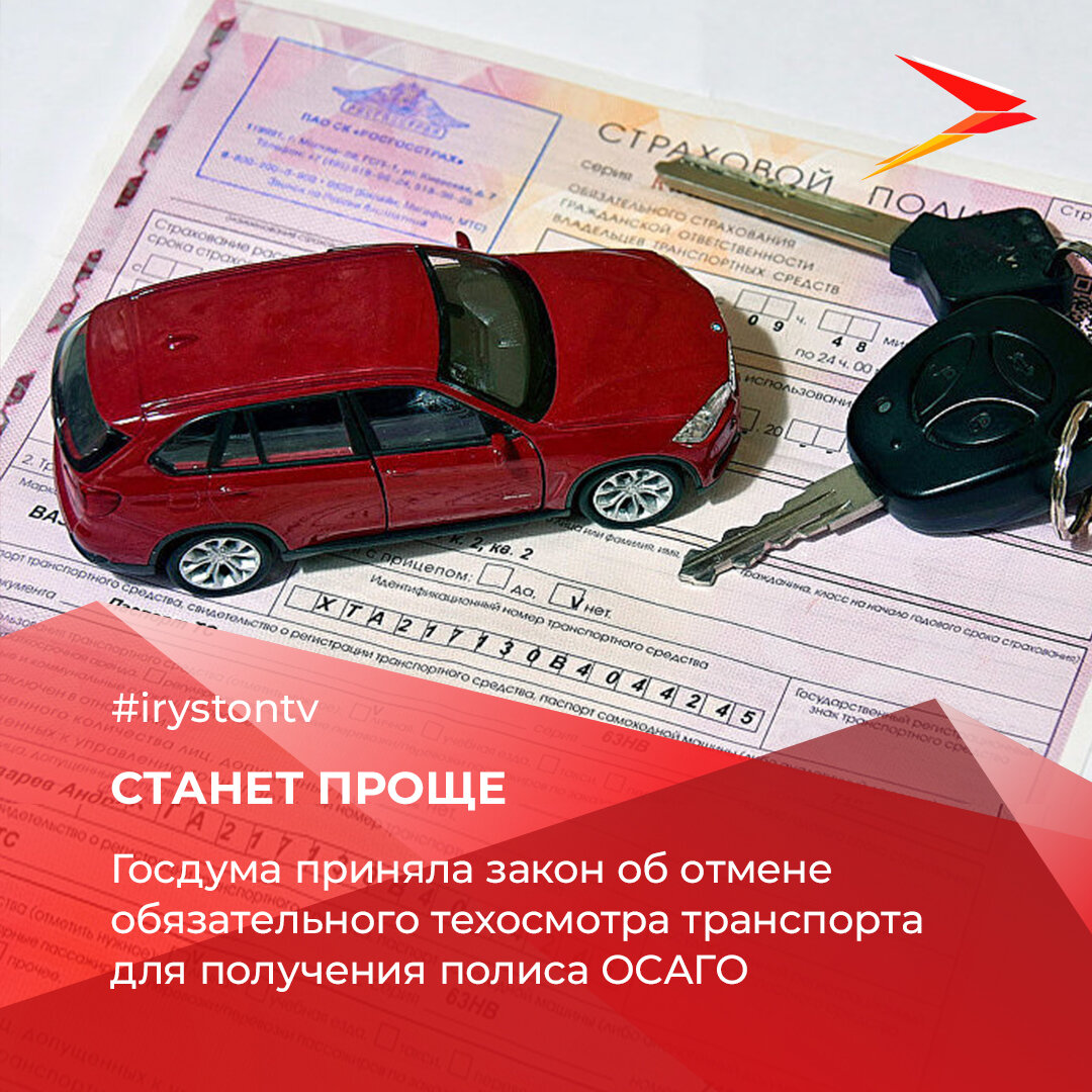Госдума приняла закон, который отменяет обязательное проведение техосмотра транспорта для получения полиса ОСАГО. Сейчас обязательное страхование гражданской ответственности владельцев транспортных средств осуществляется лишь при условии проведения техосмотра. Новый документ исключает эту норму. Теперь для получения полиса ОСАГО водителю не понадобится предоставлять диагностическую карту и подтверждать прохождение техосмотра. Закон должен будет вступить в силу с 22 августа 2021 года.