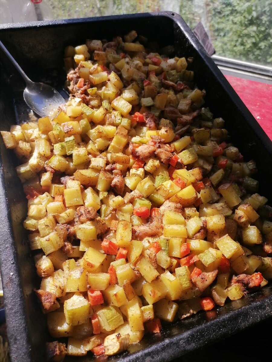Мелко нарезать кубиком, высыпать в форму, добавить растительное масло, специи(чеснок, копчёная паприка, имбирь, кориандр, укроп, соль), накрыть фольгой и в предварительно разогретую духовку на 180° на 60мин, потом фольгу снять и ещё 20мин на 300° для румяной корочки