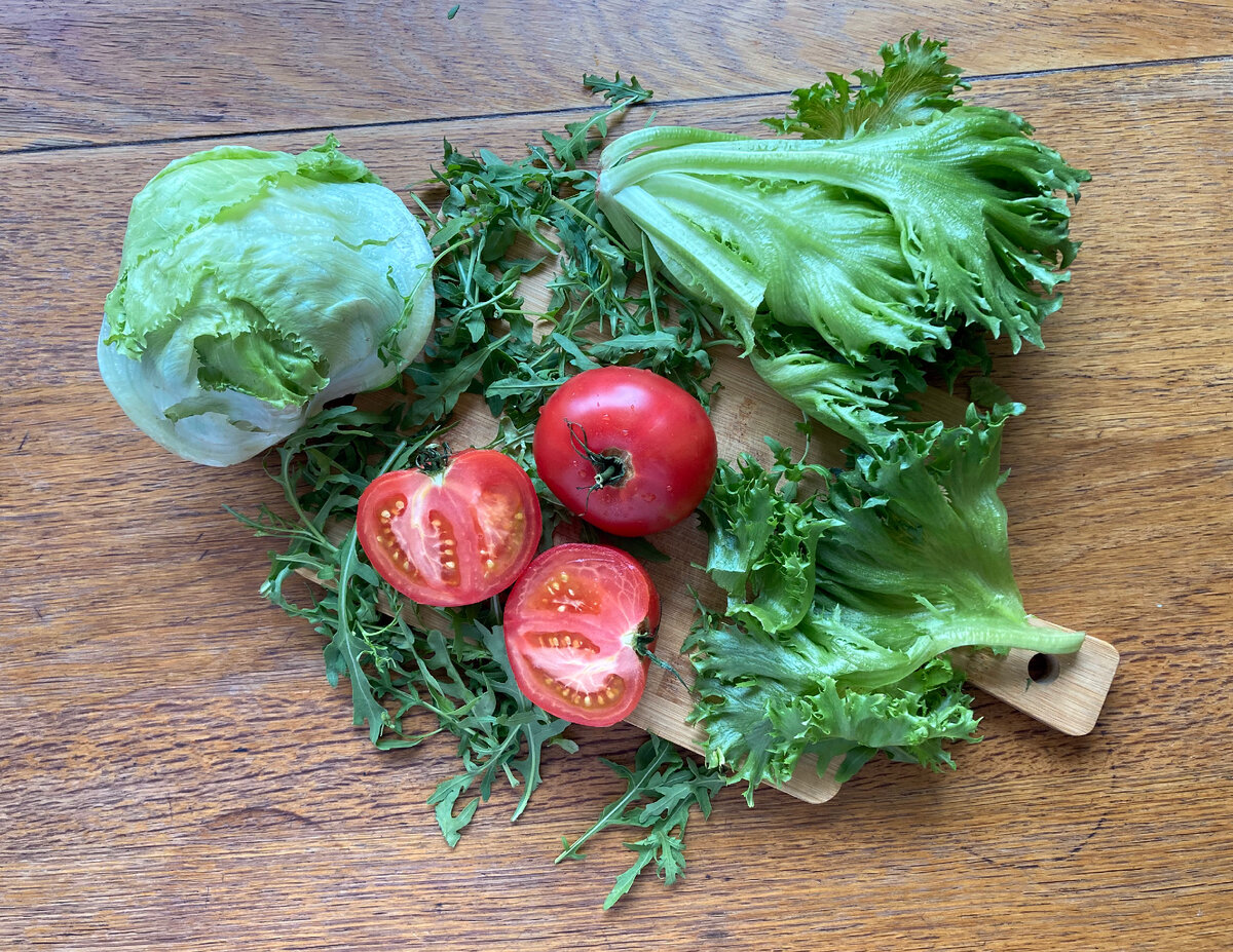 Летом, в общем, можно особо не готовить - когда уже появились настоящие помидоры, что еще нужно, кроме как порвать-порезать ворох всяких растений! Ну, разве что чем-то все это грамотно приправить. Любой свежий салат для меня всегда воспоминание о любимом Крите. Там критскую разновидность знаменитого греческого салата принято готовить с сухарями, которые даже продаются специально наломанными и насушенными в хлебных отделах - очень удобно. В моей дежурной пятере (тм) ничего такого, как вы догадываетесь, не предлагают, но у меня есть подсохшие корочки от ржаного хлеба, которые с ролью сухарей вполне справляются. Немного свежераздавленного черного перца, лимонный сок и оливковое масло - это альфа и омега любого свежего салата, о них и говорить специально не нужно. А вот эти белые шарики - вы знаете, что это такое? Это такой сырный продукт, традиционный для народов Средней Азии. Называется это курт, а покупаю я его на рынке у представителей той самой Средней Азии. Кто никогда его не пробова