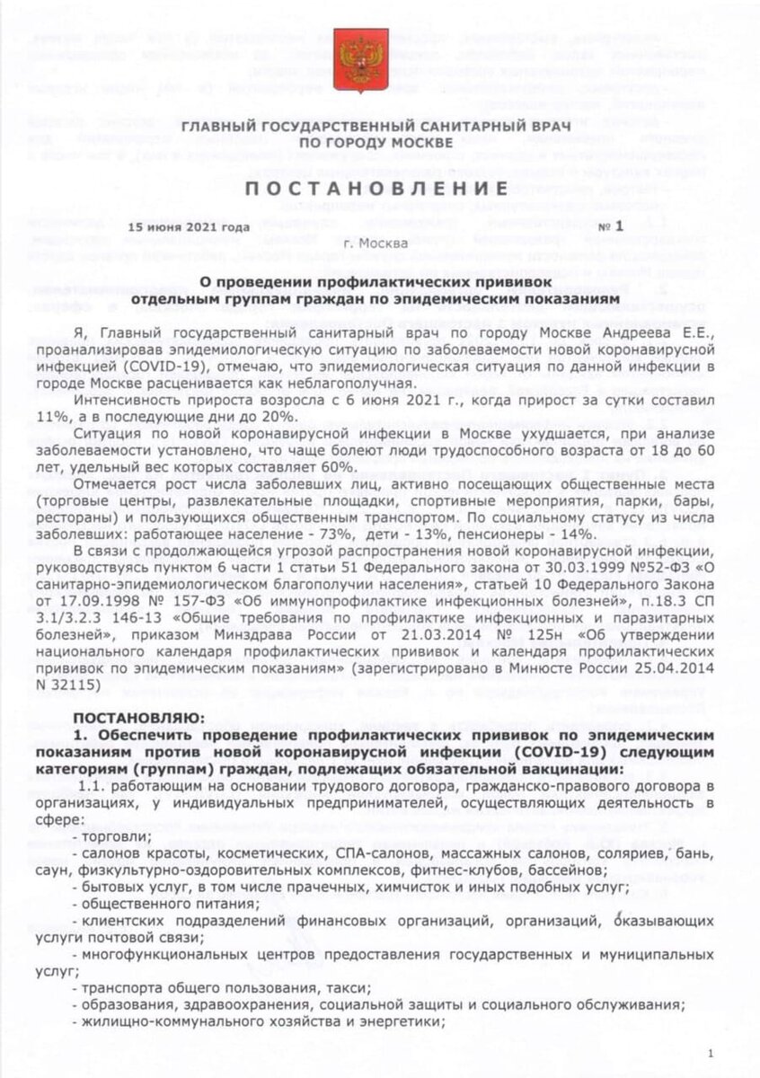 Постановлением главного государственного санитарного врача г. Москвы за номером 1 "О проведении профилактических прививок..." почти все категории работающих на бюджете граждан подлежат обязательной вакцинации первым компонентом до 15 июля 2021 года.