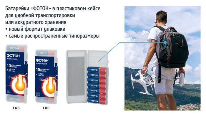 Рады представить вам новые позиции элементов питания «ФОТОН»! 1. Самые распространенные типоразмеры алкалиновых батареек – пальчиковые и мизинчиковые - в новом формате упаковки. 2 SKU: LR03 PB10, LR6 PB10 2. Алкалиновые батарейки (12 V) для сигнализаций, игрушек, пультов ДУ, медицинских приборов и тд. 2 SKU: 23A BP1, 27A BP1 3. Алкалиновые батарейки – «таблетки» для часов, игрушек, калькуляторов и будильников. 4 SKU: LR41 BP10, LR43 BP10, LR44 BP10, LR54 BP10 Новые позиции батареек обладают преимуществами элементов питания «ФОТОН»: время их работы сопоставимо или лучше аналогов мировых брендов, а цена ниже в 1,5 – 2 раза.