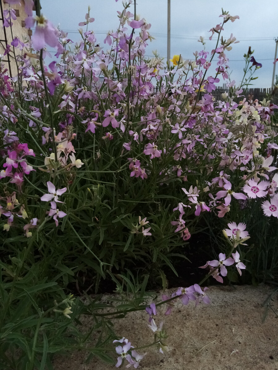 Я всегда обращаю внимание на то, какие цветы растут у людей в палисадниках и садах. И чаще всего это один и тот же набор - пионы, ромашки, лилии, из однолетников - петунии, бархатцы и львиный зев. Встречаются, конечно, и другие цветы, здесь я сильно обобщаю. Но в итоге все цветники в итоге похожи. Когда вечером, после того, как всё полито, я присаживаюсь на скамейку с чашкой кофе, то наслаждаюсь ароматом ночной фиалки и думаю, почему её перестали сажать? Я не вижу её ни в садах, ни на городских клумбах. А ведь это весьма неприхотливый цветок, который размножается самосевом. Вырастить маттиолу не сложно - раскидать семена в рыхлую почву и хорошо полить. Я согласна, что ночная фиалка цветёт только вечером и в пасмурные дни, а днем красоты нет. Но согласитесь, в цвету она прекрасна, несмотря на простенькие цветки. Благодаря массовому роспуску бутонов создаётся впечатление светло-сиреневого облака. Обычно маттиолу сажают для аромата, но мне нравятся и сами цветы. Они хорошо смотрятся