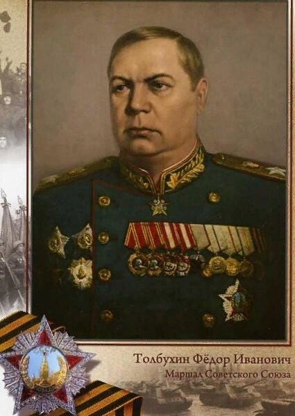 Фёдор Иванович Толбухин - выдающие полководец, Маршал Советского Союза. До последнего дня своей жизни Фёдор Иванович продолжал работать на благо Родины. Родился Фёдор Иванович 16 июня 1894 году в деревне Андроники Ярославской губернии, в крестьянской семье. Успешно прошёл обучение в церковно - приходской школе и земской школе села Давыдково ( впоследствии названного его именем - Толбухино). Отучился в Коммерческом училище, работал бухгалтером. С приходом Первой мировой войны Фёдору пришлось стать военным. После школы прапорщиков командовал ротой, батальоном на Юго-Западном фронте, был награждён орденами Анны и Станислава. В августе 1918 года Фёдор Иванович вступил в ряды Красной Армии. В 1921-1922 годах принимал участие в подавлении Кронштадтского восстания и военных действиях против финских отрядов в Карелии. С июня 1938 года Фёдор То