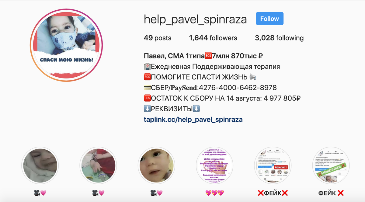 «Спаси мою жизнь! Срочно нужна поддерживающая терапия. Стоимость — 7 млн 870 тыс. рублей» — так начинается описание профиля в Instagram. Тут же реквизиты для перевода. На аватарке — фото мальчика Павла, на вид двухлетнего, инвалида со СМА (спинальной мышечной атрофией, редким врождённым заболеванием).