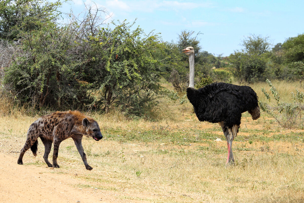 Гиены внушают страх многим обитателям Африки. Даже львы с опаской относятся к этим хищникам — каким бы сильным ни был царь зверей, в одиночку он не сможет противостоять целому клану гиен. А как обстоят дела с африканскими страусами? Эти гигантские птицы обладают одним из самых сильных ударов в животном мире. Защищаясь, они способны «прихлопнуть» даже льва. Африканским страусам приходится сталкиваться с разными хищниками — на них охотятся львы, леопарды, гепарды и... пятнистые гиены. Причем самыми опасными являются именно гепарды — только им под силу догнать взрослого страуса, который может бежать со скоростью до 70 км/ч. Однако один гепард из-за своей небольшой массы тела с гигантской птицей не справится. Нужно как минимум 2-3 диких кошки. Что касается львов, леопардов и гиен, то страусы легко могут от них убежать. Исключения составляют те случаи, когда страуса застали врасплох, и он не смог вовремя «дать деру». Пятнистые гиены редко когда нападают на взрослых страусов, потому что они