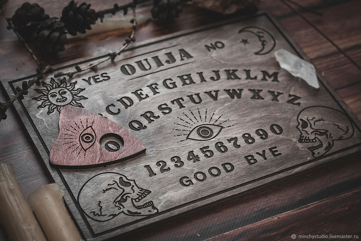 По сути, эта игра представляет собой небольшую дощечку с начертанными на ней буквами алфавита, цифрами от 1 до 9, словами «да» и «нет» и указателем. Он перемещается с помощью руки по доске, указывая на буквы, из которых складываются слова. Считается, что в этот момент с человеком говорит дух.