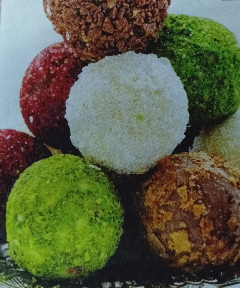 - Шарики по отдельности обвалять в кокосовой стружке, арахисовой и фисташковой крошке, в тертом шоколаде. Отправить на 30 минут в холодильник.