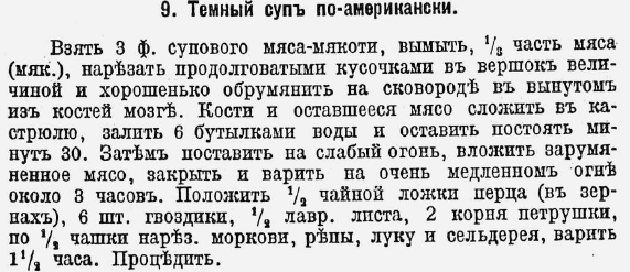 В Российской Империи выходил "Журнал для хозяек" в 1913 и 1914 годах в конце каждого выпуска печатались рецепты кушаний которые опубликовали в "Кулинарном сборнике" в 1915 году. В "Кулинарном сборнике" опубликовано 504 рецепта. Из них самые необычные приведу ниже. 1) Тёмный суп по-американски. Взять 1,4 кг супового мяса-мякоти, вымыть одну третью часть мяса (мякоти), нарезать продолговатыми кусочками величиной 5 см и хорошенько подрумянить на сковороде в (костном) мозге вынутом из костей. Кости и оставшееся мясо сложить в кастрюлю, залить 3,6 литрами воды и оставить постоять 30 минут. Затем поставить на слабый огонь, вложить зарумяненное мясо, закрыть и варить на очень медленном огне около 3 часов. Положить половину чайной ложки перца (в зернах), 6 штук гвоздики, половину лаврового листа, 2 корня петрушки, по пол чашки нарезанной моркови, репы, лука и сельдерея, варить полтора часа. Процедить. 2) Суп испанский с пармезаном. Приготовить бульон из 1,4 кг говядины. Когда будет готов,