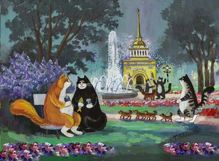 Все, кто бывал в Петербурге, знают, что это город, где очень любят кошек. Они часть городской культуры и поэтому местные художники часто рисуют котов, через них рассказывают о своем городе и о любви к нему. Я уже писала о котохудожнице Петербурга Ирине Зенюк, а сегодня хотела вспомнить о еще одной художнице, которая рассказывает в своих картинах забавные истории из жизни котов Петербурга. Это Татьяна Родионова. Она – художник-любитель. В детстве она получила образование в художественной школе. Но профессию она выбрала совсем другую. Родионова окончила математический факультет Петербургского университета и работала программистом. Но в начале 2000-х годов она начала снова рисовать и ее коты стали очень популярными. Татьяна Родионова очень любит котов, в ее доме живут пять кошек, которые и являются источником вдохновения художницы. Котики Родионовой особенные, они такие хулиганские, неформальные. Родионова создает юмористические сюжеты, ее коты неизменно заставляют улыбнуться. При этом Та