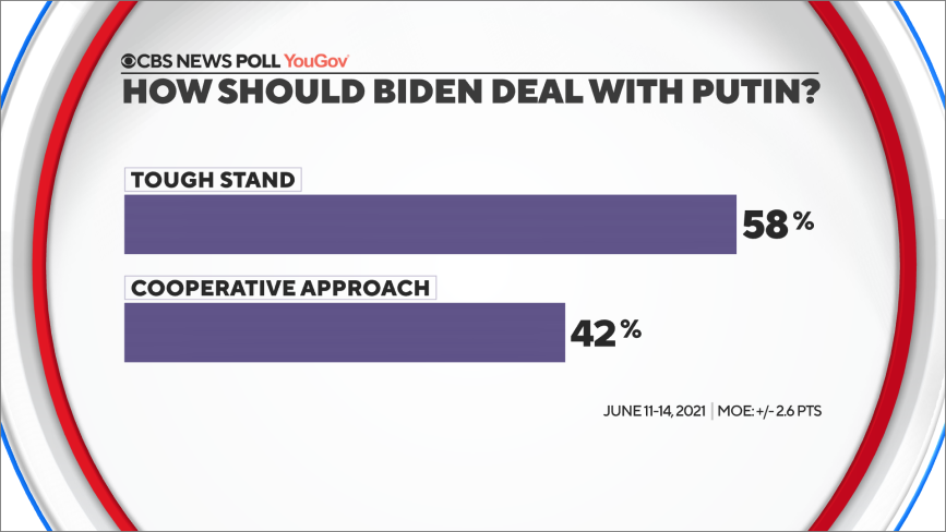Согласно результатам опроса, проведённого CBS NEWS, большинство американцев хотят, чтобы в общении с Владимиром Путиным на саммите Джо Байден занял жёсткую позицию. По их мнению, Россия осуществляет кибератаки против США и пытается оказывать влияние на американскую политику и выборы. Согласно результатам опроса, большинство американцев хотят, чтобы в общении с Владимиром Путиным на саммите Джо Байден занял жёсткую позицию, потому что они считают, что Россия осуществляет кибератаки против США и пытается оказывать влияние на американскую политику и выборы. Как передаёт CBS NEWS, связанные с Россией кибератаки — это та тема, которую, по мнению американцев, Байден должен поднять во время встречи с Путиным прежде всего. Как отмечает канал, большинство демократов и республиканцев считают, что Россия предпринимает провокационные действия, в частности проводит кибератаки, пытается оказывать влияние на американскую политику и выборы, старается ослабить альянс НАТО в Европе. Те респон