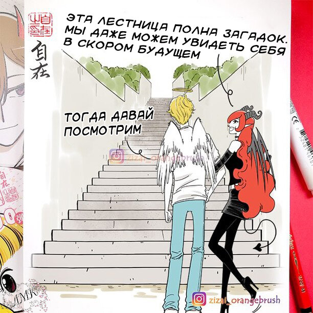 Уже многие написали о том, что хотели бы посмотреть, как ангел и Суккуб прогуляются по лестнице будущего. Так что, сегодня у меня для вас сразу две новости: хорошая и плохая. Хорошая: Сегодня будет невероятно милый комикс об этой прогулке. Плохая: Я перевела все комиксы от Цзы Цзай об этой паре, который сейчас есть в его английском аккаунте. Теперь комикс об этой паре переходит в режим: как появится на английском - так сразу переведу и на русский. Однако, не волнуйтесь слишком сильно, так как у меня еще есть с десяток комиксов, где Цзы Цзай рассказывает сразу о нескольких парочках, в числе которых, разумеется, есть и эти милашки. Кстати, для тех кто не знает, то на моем канале сейчас начал выходить новый объемный комикс, примерно в таком же стиле рисовки, юмора и прочего: Захватывающая история о молодых магах в комиксах. Эпизод 1 Этой статьи почти нет в ленте, и возможно даже не видно с телефонов. Так что просто говорю, что теперь я пытаюсь переводить и такие веб-комиксы. Ну а тепер
