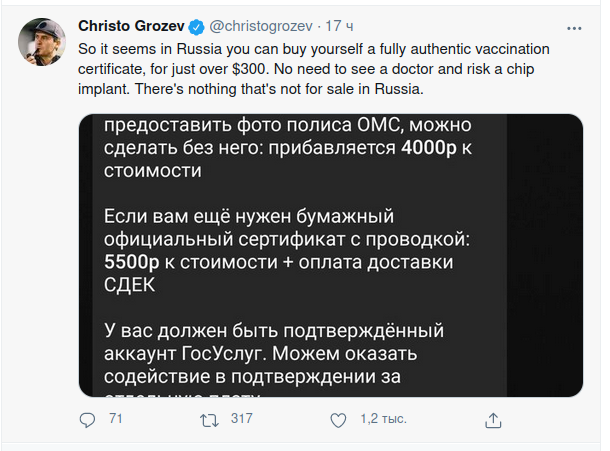 Чем отличается простое враньё по незнанию от намеренного набрасывания экскрементов на вентилятор в рамках информационной войны? Иллюстрирует беллингкетовский 'расследователь' Христо Грозев, в простонародье - русофоб на зарплате МИ-6. 'Так что, похоже, в России вы можете купить себе полностью подлинный сертификат о вакцинации всего за 300 долларов. Нет необходимости обращаться к врачу и рисковать имплантацией чипа. В России нет ничего, что не продавалось бы.' - сообщает нам Христо. Чувствуете, чем запахло? Продажа левых сертификатов о вакцинации - это действительно исключительное вредительство, за которое надо сажать далеко и надолго не только продавцов, но и покупателей. Но речь не об этом. Только очень наивный и некритично настроенный к окружающему миру человек подумает, что Россия в этом плане чем-то сильно отличается от других стран. 1. Возьмём публикацию The Guardian от 16 мая. Перевод: Рынок поддельных вакцин и сертификатов на тестирование Covid растет. Более 1200 поставщик