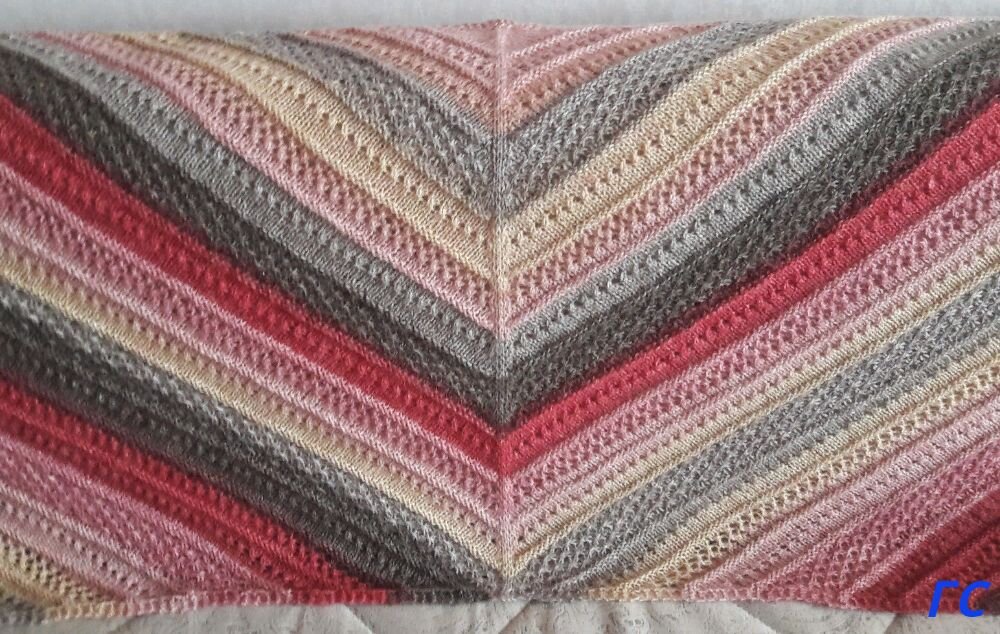 Размер 215 х 63 Начало вяжется от середины основания, как треугольная шаль, до желаемой ширины. Затем в обе стороны отдельно по косой. Схема направления вязания Зеленые линии - прибавки, красные убавки в каждом лицевом ряду. Центр я сделала плотным из трех петель. Схема полос в моем варианте Обозначения в конце схемы, начиная с 39 ряда, вяжутся так В изделии нет ни одного лицевого ряда, где нет прибавлений или убавлений. Прибавляемые петли вводятся в узор, а убавляемые его сокращают. Можно подбирать и чередовать понравившиеся узоры на свой вкус. Вяжите на радость себе и близким!