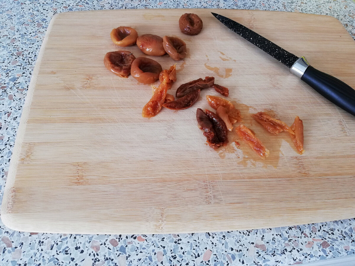 Сухофрукты нарезаем тонкими ломтиками.