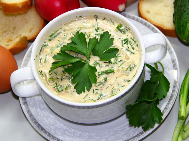 Такая сытная деревенская похлебка покорит любителей холодных супов. Да и остальные домочадцы равнодушными не останутся.