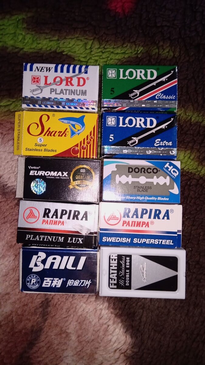 Давно хотел про лезвия для бритв т-образных пару слов черкнуть, и вот сподобился. Сейчас в моде бритвы с многолезвийными касетами, дорогие и не всегда получаешь на лице, что хочешь. Для объективности подготовил десять разных лезвий, не дорогих, но интересных. Dorco ST 300, 4 лезвия Lord (Classic, Extra, Platinum и Shark), Euromax, 2 Rapira (Swedish и Platinum lux), Baili Platinum +?, Feather. Бритва Timor Butterfly, помазок барсук Merkur и мыло Safeguard. Разводить канитель не буду, сразу к делу. Главное в пене не густота, а как бритва скользить будет. Щетина средняя. Бреюсь в 6 утра. За сутки вырастает около пол миллиметра и получается. Как хороший наждак на ощупь. Каждое утро использовал новое лезвие, чтоб ощущения не забылись. Итак, горячей водой смочить помазок, хорошенько горячей водой смочить лицо, даже распарить. Натираем мылом лицо. Образуется мыльный налет на лице. Еще смочить помазок и взбиваем пену на лице. Пена будет густая и скользкая. Лезвия оценивал по таким параметрам: