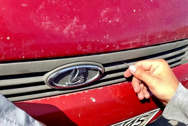Известно несколько распространенных методов открыть крышку отсека при обрывании каната. Если на Ладе Калина установлена не стоковая облицовка со значком, а тюнингованная, то процесс заметно осложняется. Придется поднять машину на яму и попробовать воздействовать на механизм снизу или же вырезать отверстие, а после заменить переднюю декоративную накладку. А вот с заводской решеткой все гораздо проще.