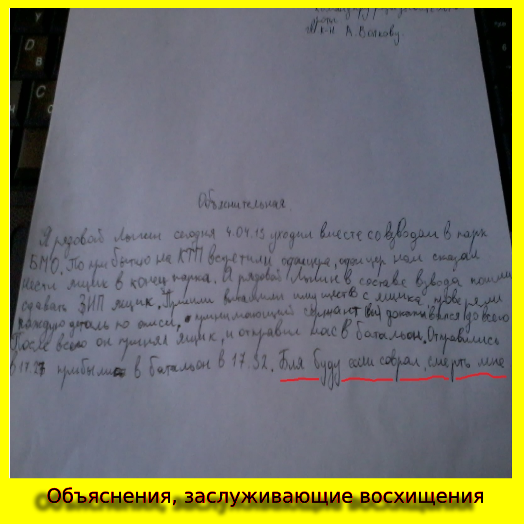 Предлагаю еще одну подборку юморных объяснений военнослужащих. Судя по активности на статье - Объяснения военнослужащих, прочитав которые, обязательно улыбнетесь. Подборка военного юмора, эта тема очень понравилась нашим читателям. Читаем перлы-объяснительные дальше. Заслуживает внимание честность военнослужащего - не подлежит никакому сомнению. Здесь не совсем объяснение. Заслуживает всяческого внимания резолюция командира. Всем определил, что делать. Особенно задача психологу: провести обследование данных офицеров на предмет наличия совести. За такое объяснение медаль давать надо, а не наказывать. Оправдания майора - четко, лаконично и понятно. Объяснение из 80-х годов. Все честно и по факту. Только зачем? Еще интересное на канале. Посчитал пенсию сержанта полиции после индексации. Больше ли прожиточного минимума? Поднимите себе настроение - подборка иностранного легиона швейно-пехотных войск Посчитал размер пенсии прапорщика после повышения окладов. Расчет на онлайн-калькуляторе