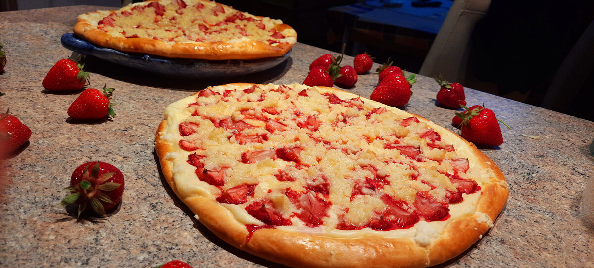Ингредиенты Тесто: Творожная начинка: Ванильный сахар: Приготовление Из сырья делаем гладкое тесто и оставляем подниматься. Тем временем готовим творожную начинку и крошку. Затем разделяем тесто на две одинаковые буханки, которые раскатываем на лепешку. Натираем края яичным белком. Лепешки смазываем творожной начинкой, украшаем клубникой и посыпаем крошками. Выпекайте около 20 минут при температуре 160 градусов на горячем воздухе.