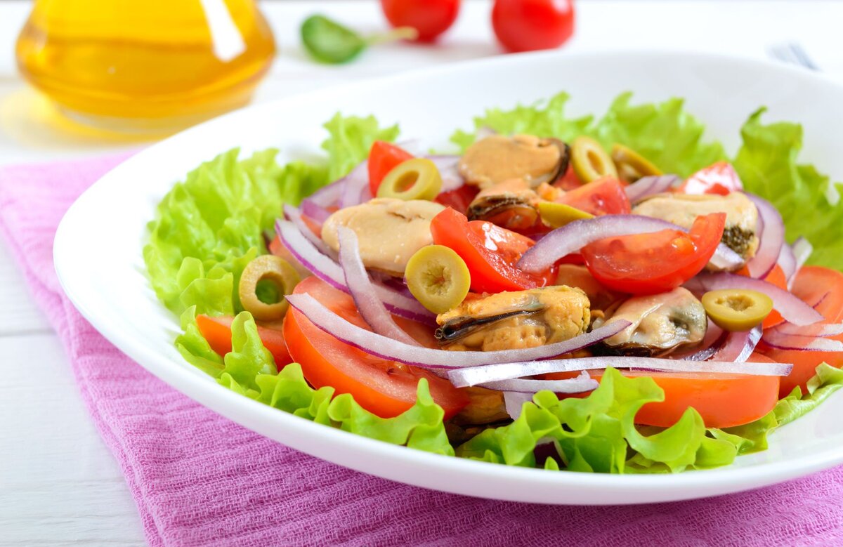 Салат из маринованных мидий, помидоров и оливок: легкий ужин за 3 минуты