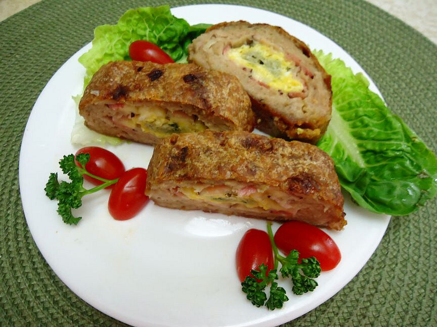 Ингредиенты Приготовление Мы поворачиваем духовку до 170 ° C снизу/сверху. Выложить мясо в миску (можно также купить фарш), добавить мелко нарезанный лук, соль, специи, яйца и соламил. Тщательно перемешайте, переложите на силиконовую основу, фольгу или бумагу для выпечки и сформируйте прямоугольный слой мяса (в соответствии с размером противня). Положите бекон на мясо, положите на него сыр и положите яичницу на один из длинных краев. Затем, используя прокладку (бумагу), плотно раскатываем рулет и заклеиваем концы, чтобы сыр не вытекал. Переложите рулет в форму для запекания, слегка залейте и накройте крышкой или фольгой, выпекайте около 35-45 минут. Затем снимите крышку, добавьте столовую ложку свиного сала, поднимите температуру до 200 ° C, включите горячий воздух и выпекайте около 10-15 минут до золотистого цвета. Подавать с по-разному заправленным картофелем и салатом или с соусом (чеснок, горчица, ложная вырезка) и клецками.